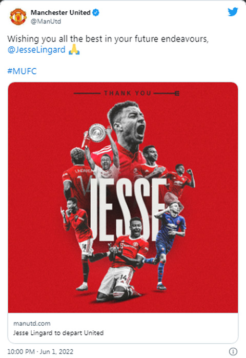 Về phần Man United, họ đã chia tay 3 ngôi sao kể từ sau khi kết thúc mùa giải 2021/22. Đó là tiền đạo Edinson Cavani, tiền vệ Paul Pogba và mới nhất là Lingard. Ngoài ra, HLV tạm quyền Ralf Rangnick cũng chia tay CLB chứ không đảm nhận vai trò cố vấn như thỏa thuận trước đó.