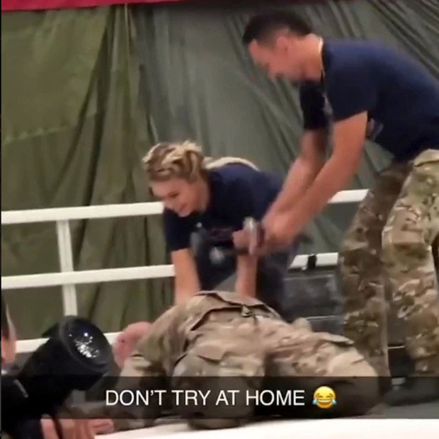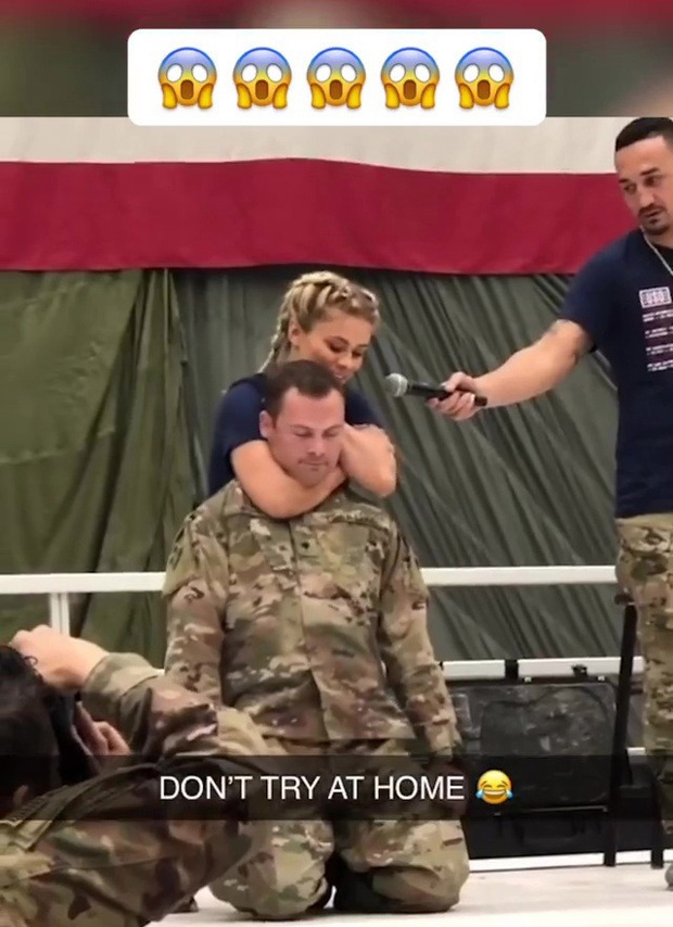 Mới đây, nữ võ sĩ Paige VanZant khiến các fan chú ý khi đăng tải trên story cá nhân đoạn video ghi lại sự cố trong một tour diễn. Theo đó, mỹ nhân 27 tuổi thực hiện kỹ thuật khóa cổ với một binh sĩ Mỹ.