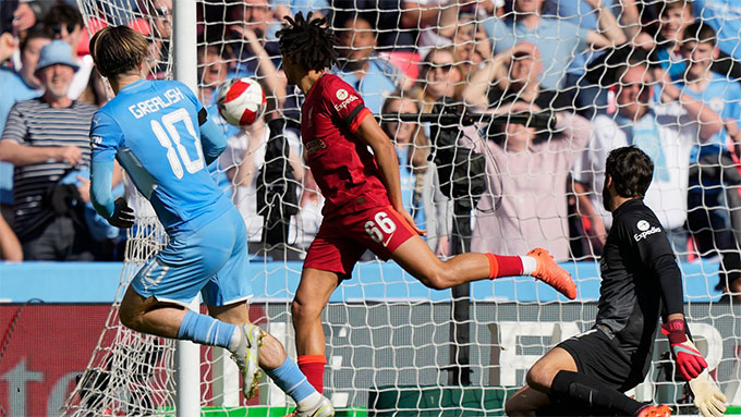 Trong thế trận như vậy, không ngạc nhiên khi Liverpool khai thông được thế bế tắc ngay ở phút thứ 10. Xuất phát từ tình huống đá phạt góc bên cánh trái của Robertson, trung vệ Konate đã phát huy được điểm mạnh không chiến khi bật cao đánh đầu tung lưới Man City.