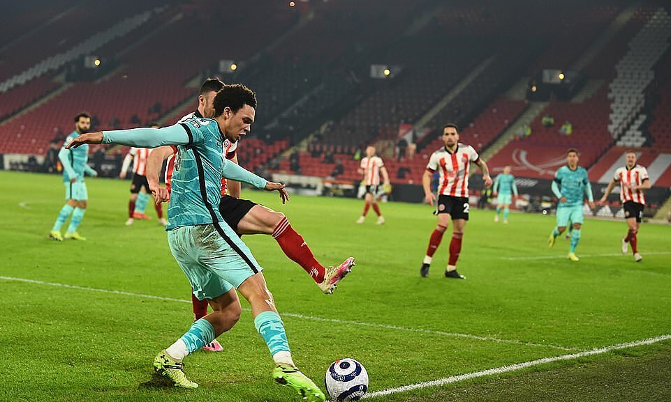 Aaron Ramsdale có hiệp một tuyệt vời, với năm pha cản phá thành công những nỗ lực từ Liverpool. Nhưng khi đồng đội của anh chần chừ, vì cho rằng Alexander-Arnold để bóng hết biên ngang trong tình huống ghi bàn, thủ môn Sheffield không thể cản cú sút căng sát chấm 11m của Jones. Đội chủ nhà phân trần với trọng tài chính Jon Moss, nhưng không có tín hiệu nào từ phòng VAR.