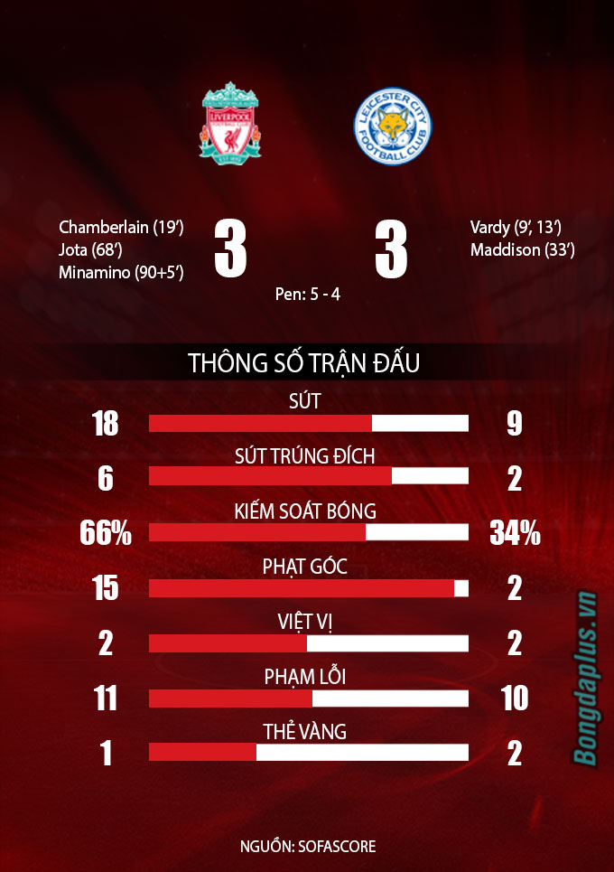 Không thể phân định thắng thua trong 90 phút, hai đội buộc phải bước vào loạt luân lưu. Luke Thomas và Bertrand là những người không thực hiện thành công 11m bên phía Leicester, trong khi Liverpool chỉ có Minamino đá hỏng.