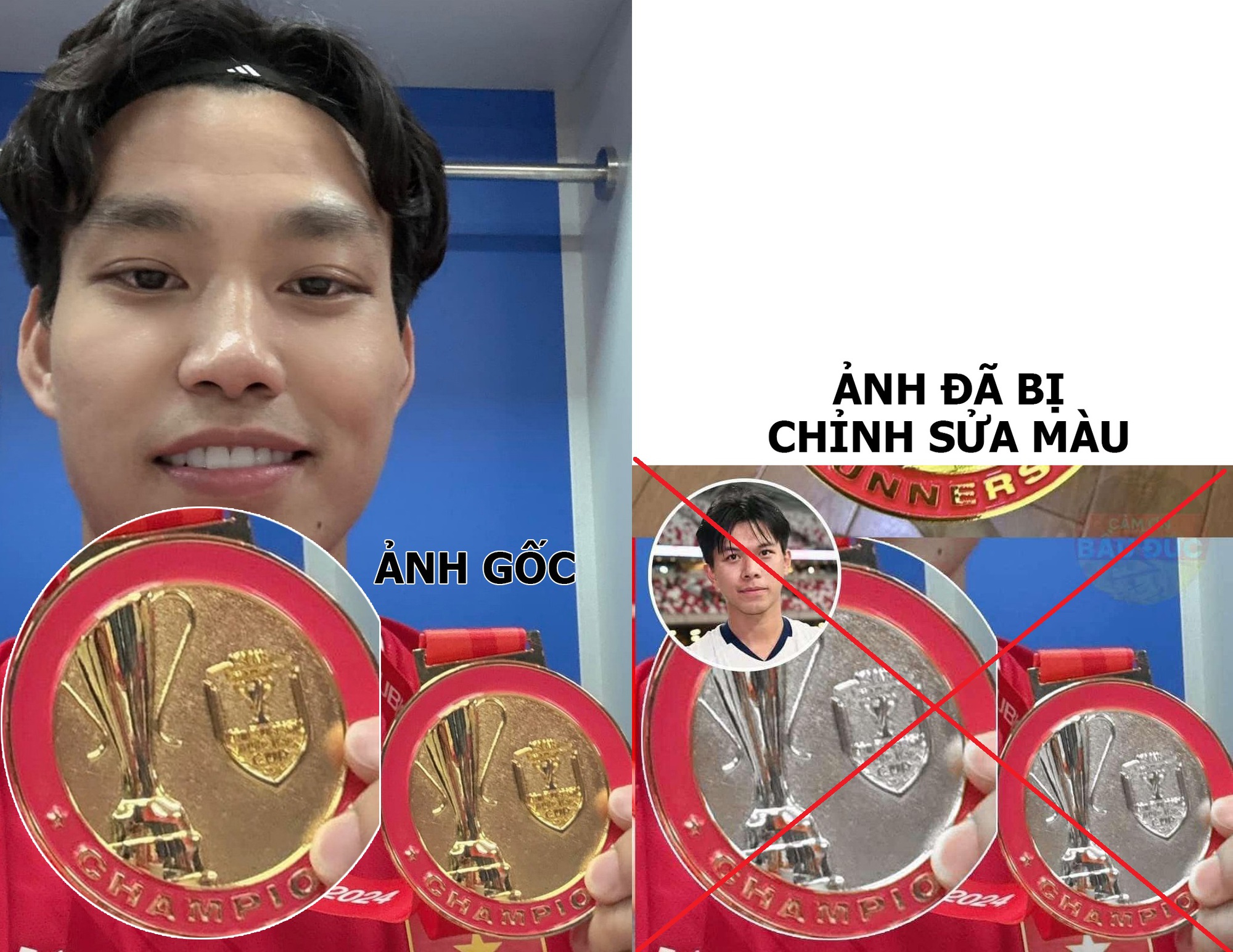 Cụ thể, từ ảnh gốc là tấm huy chương vàng của Văn Thanh, có người đã cố tình chỉnh sửa, đổi từ màu vàng thành màu bạc và ghép thêm hình Pansa Hemviboon để đánh lừa dư luận.
