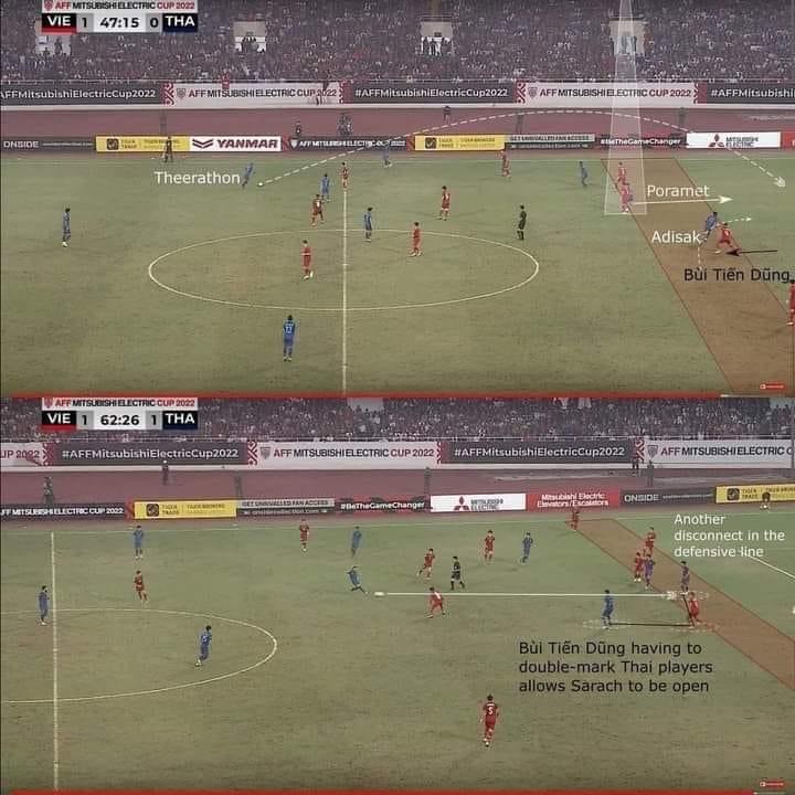 Đến trận chung kết lượt đi với Thái Lan, HLV Park Hang Seo tái sử dụng Duy Mạnh đá với Quế Ngọc Hải và Bùi Tiến Dũng. Tuyển Việt Nam trả giá đắt bằng điểm yếu từng diễn ra trước Indonesia. Sự khác biệt là Thái Lan ghi bàn. Ông Park vá bằng Việt Anh thay Duy Mạnh nhưng Bùi Tiến Dũng mắc sai số trong bàn thua thứ hai. Ông Park tiếp tục thay Thanh Bình vào thế Bùi Tiến Dũng, sau đó trung vệ trẻ này có pha trả bóng cho Văn Thanh ghi bàn. Việt Nam chỉ có khoảng 10 phút chơi với 3 trung vệ Quế Ngọc Hải - Thanh Bình - Bùi Đoàn Việt Anh, những người từng chơi rất hay trong ngày hoà Nhật Bản 1-1 vào tháng 3 năm ngoái.