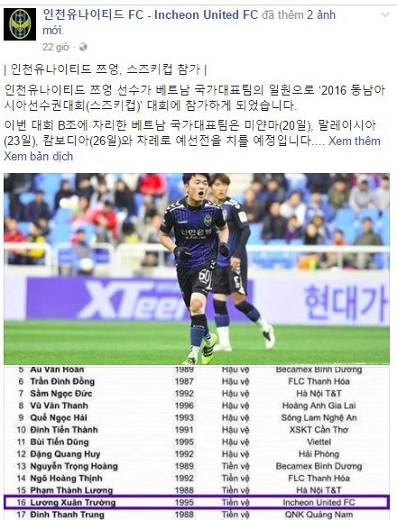 Thông báo của Incheon viết: "Lương Xuân Trường, cầu thủ của Incheon United đang khoác áo đội tuyển Việt Nam. Anh là một thành viên của Việt Nam tham dự AFF Cup 2016.