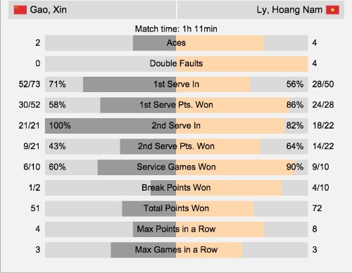 Ở game thứ 12, Xin Gao vượt lên dẫn trước 30-0 và tưởng như sẽ giành chiến thắng. Bất ngờ, Hoàng Nam ăn liền bốn điểm để lần thứ hai giành break và chiến thắng ở ván đấu đầu tiên với tỷ số 7-5.