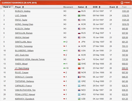 20/04/2015 14:16Lý Hoàng Nam vươn lên hạng 14 trẻ thế giới