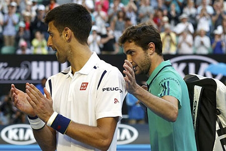 Gilles Simon (phải) dồn Novak Djokovic tới 5 set đấu trong 4 giờ rưỡi đồng hồ |