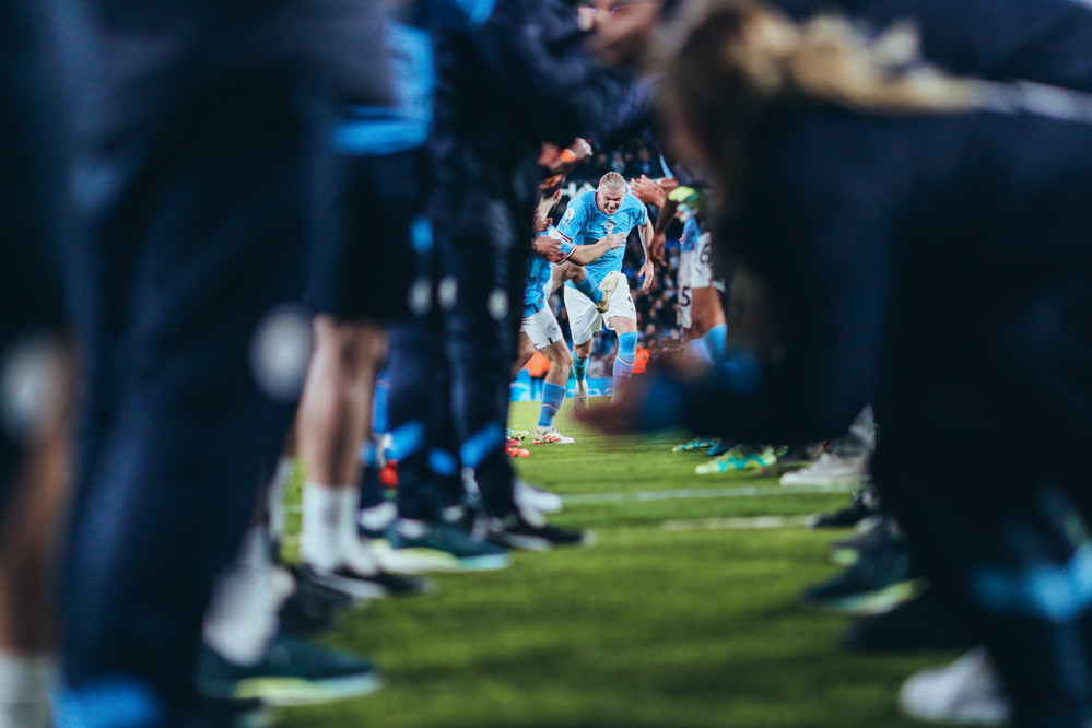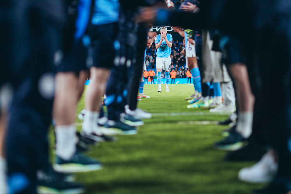 Các thành viên Man Ciy xếp thành hàng rào chúc mừng Erling Haaland khi tiền đạo Na Uy xô đổ kỷ lục ghi nhiều bàn thắng nhất trong một mùa giải Premier League, với 35 pha lập công.