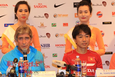 HLV Pellegrini ngồi cạnh HLV Miura - Ảnh: Đức Cường |