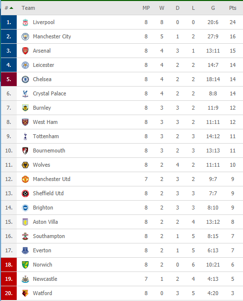 Để thua sốc trên sân nhà, Man City vẫn giữ được vị trí thứ 2 nhưng đã bị đội đầu bảng Liverpool bỏ xa tới 8 điểm. Trong khi đó, Wolves leo lên vị trí thứ 11 với 10 điểm trong tay.