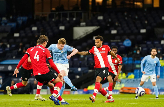 Dù để Southampton rút ngắn cách biệt còn 4-2 từ cú sút của Che Adams sau thoáng hớ hênh của hàng thủ ở phút 56, Man City vẫn chơi trên chân, và chỉ cần thêm chưa đến ba phút để tái lập cách biệt ba bàn. De Bruyne từ trung lộ băng lên nhận bóng của Foden rồi tìm góc sút rồi đặt lòng chân phải, ấn định kết quả 5-2.
