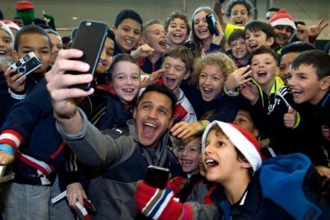 Alexis Sanchez chụp ảnh cùng các CĐV nhí của Arsenal |