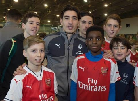 Hector Bellerin chụp ảnh với các CĐV nhí của Arsenal |