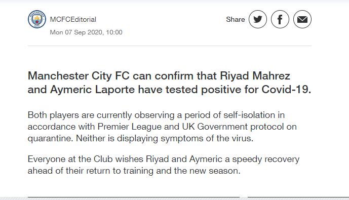 "Mọi người ở Man City chúc Mahrez và Laporte sớm hồi phục sức khỏe để có thể trở lại tập luyện cùng toàn đội". Đội chủ sân Etihad thông báo.