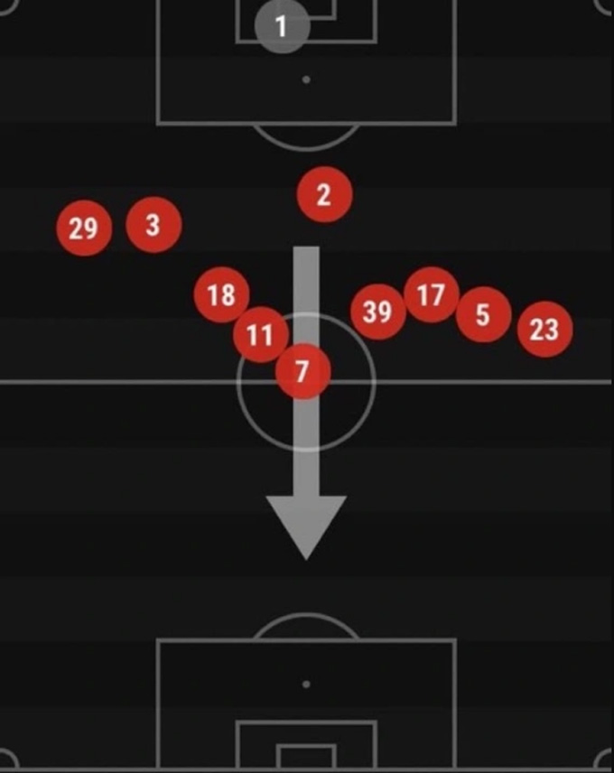 Aaron Wan-Bissaka, Eric Bailly và Victor Lindelof lùi sâu hơn một chút nhưng Bruno Fernandes, Mason Greenwood, Cristiano Ronaldo, Scott McTominay, Fred, Harry Maguire và Luke Shaw đã trải đều ở khu vực giữa sân, với số 7 ở vị trí cao nhất.