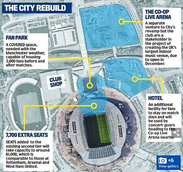 Những công trình mới trong kế hoạch thay đổi diện mạo của khuôn viên, sẽ nằm cạnh Co-op Live Arena, địa điểm tổ chức hòa nhạc trong nhà lớn nhất ở Vương quốc Anh với sức chứa 23.500 người, dự kiến khai trương vào tháng 12 cuối năm, mà Chủ tịch của Man City là một cổ đông lớn.