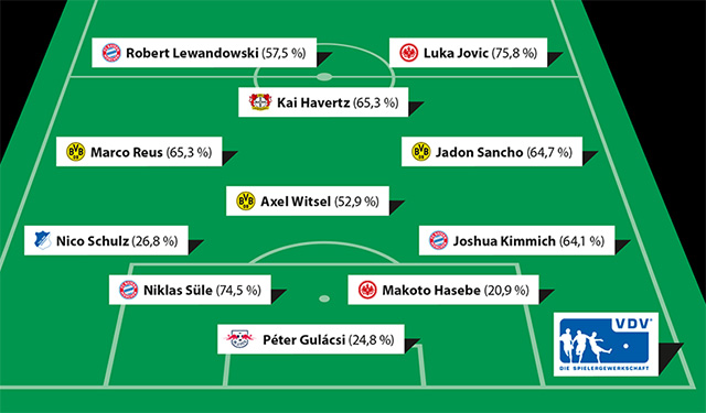 Nếu như Reus được bầu là cầu thủ xuất sắc nhất thì Sancho lại được vinh danh là gương mặt mới xuất hiện gây ấn tượng hơn cả. Với 51% số phiếu bầu, cầu thủ chạy cánh người Anh đánh bạn 2 đối thủ bám sát mình nhất là Jovic (16,3%) và Havertz (13,7%).