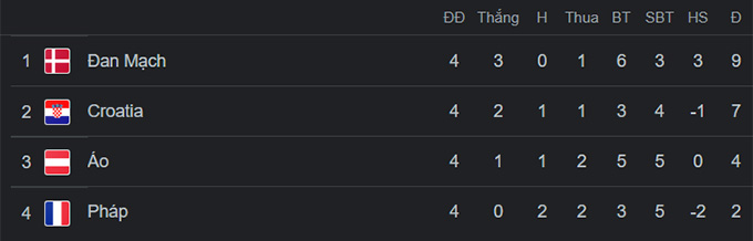 Chung cuộc sau 90 phút, Pháp thua 0-1 trên sân nhà và tiếp tục bét bảng. Ở trận đấu còn lại của bảng đấu, Đan Mạch thắng dễ Áo 2-0 trên sân nhà để củng cố vị trí đầu bảng.