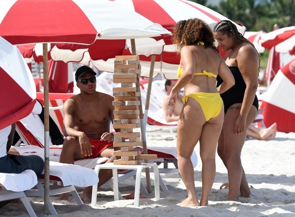 Hôm qua, tuyển thủ Pháp được thấy xuất hiện trên bãi biển với 2 phụ nữ lạ hoắc, mặc bikini khá nóng bỏng. Cả ba người say sưa chơi trò Jenga (rút gỗ).