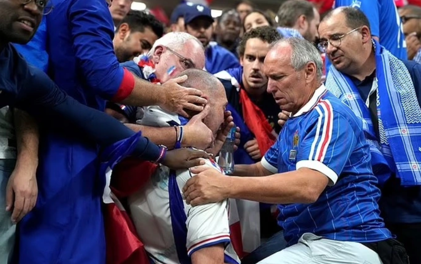 Người hâm mộ kém may mắn này đã bị choáng, ôm mặt và tỏ ra đau đớn. Những khán giả ngồi xung quanh cũng tỏ ra lo lắng và giữ lấy người đàn ông này.