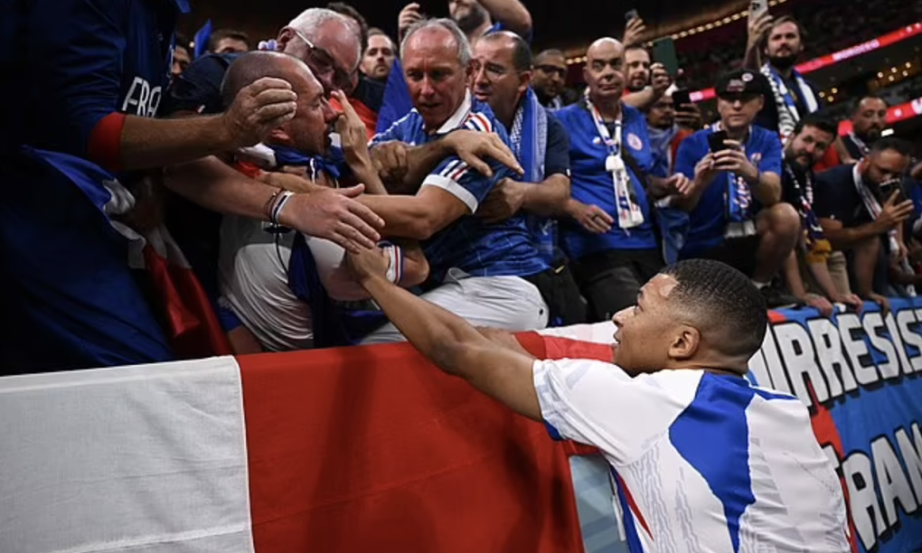 Sau đó, CĐV này đặt tay lên người Mbappe để tỏ ý nói rằng ông vẫn ổn. Những khán giả xung quanh tranh thủ giơ điện thoại lên ghi lại khoảnh khắc này.