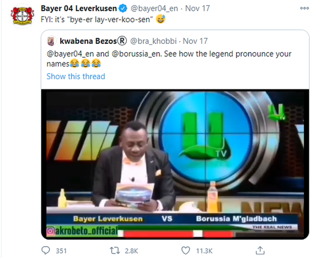 Không những vậy, nhiều CLB cùng lên tiếng ngay lập tức. CLB Bayer 04 Leverkusen chia sẻ video và đưa ra cách phát âm chuẩn nhất tên đội bóng.