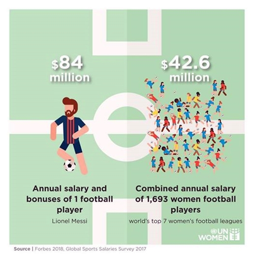 Kèm tuyên ngôn này, UN Women đăng ảnh vẽ Messi, với thu nhập năm 84 triệu USD. Đặt bên cạnh chủ nhân năm Quả Bóng Vàng là hình vẽ các nữ đồng nghiệp, kèm chú thích: "Tổng thu nhập của 1.693 nữ cầu thủ ở bảy giải hàng đầu là 42,6 triệu USD".