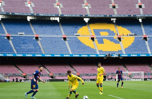 | Sân Nou Camp vắng bóng khán giả khiến trận đấu có không khí như một buổi tập. |