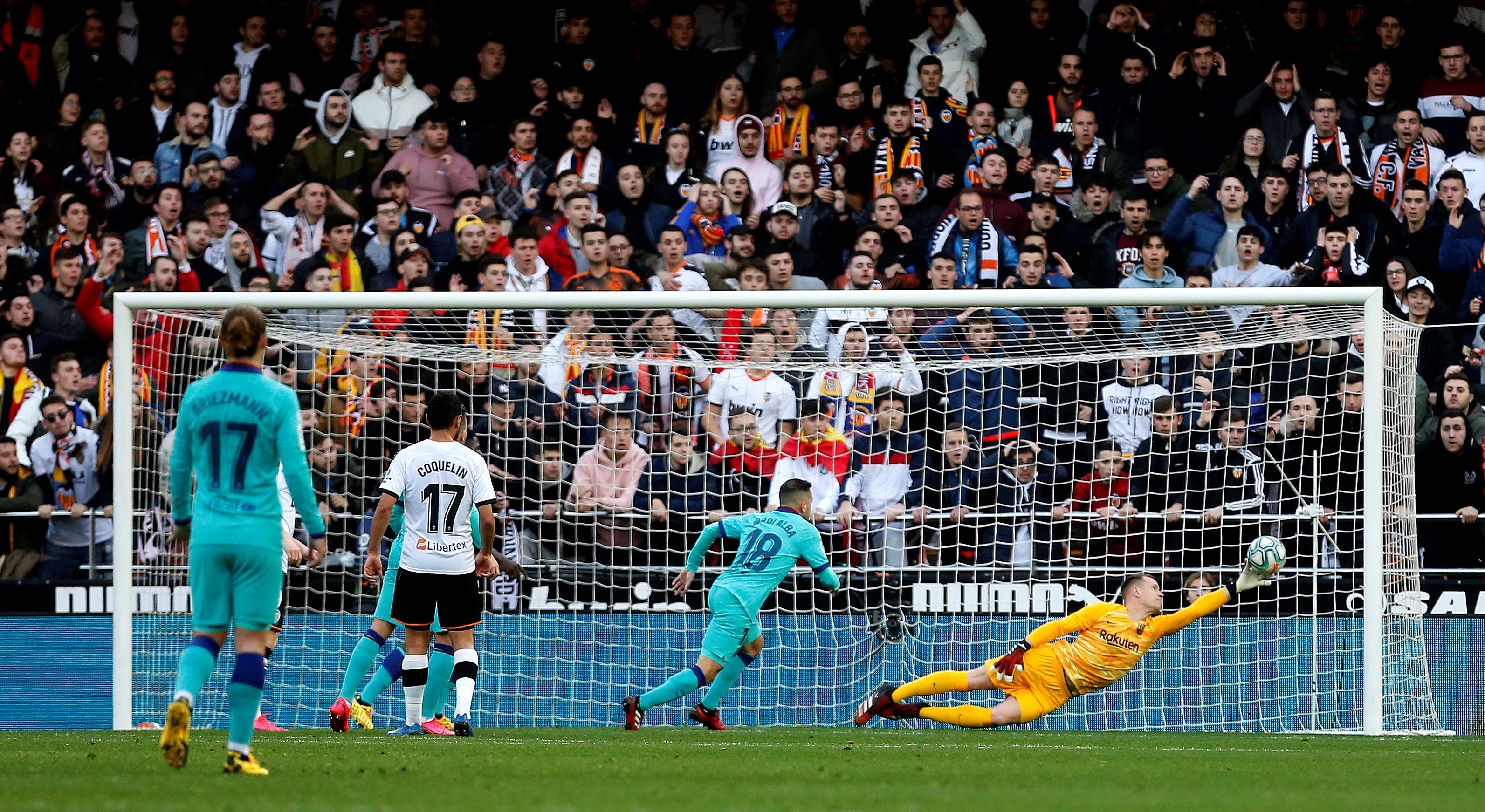 Bên kia chiến tuyến, Valencia thi đấu biết mình biết ta, tuy nhiên chính lối chơi này mang đến nhiều sự khó khăn cho đối thủ, và rồi đến phút 18, cơ hội ăn bàn rõ rệt đến với đội chủ nhà. Valencia được hưởng quả penalty nhưng trên chấm 11m, Maxi Gomez không thể đánh bại Stegen.