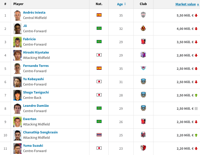 Trở lại với danh sách trên, người dẫn đầu là cái tên quen thuộc - Andres Iniesta. Cựu sao Barca hiện đang chơi cho Vissel Kobe được định giá 5,5 triệu Euro. Điều thú vị là cựu tiền đạo của Bayern Munich và Arsenal - Lukas Podolski chỉ đứng thứ 13 trong danh sách, sau Chanathip Songkrasin, với mức định giá 2 triệu Euro.