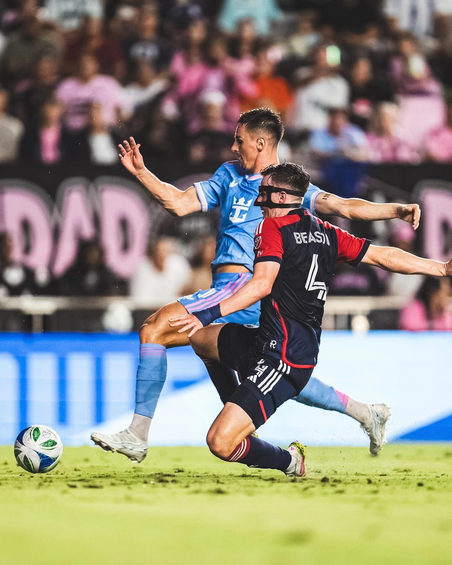 New England Revolution nhập cuộc quyết tâm và có cơ hội đầu tiên ở phút thứ 9, khi cú đánh đầu của Brandon Bye đưa bóng dội xà ngang khung thành Inter Miami .