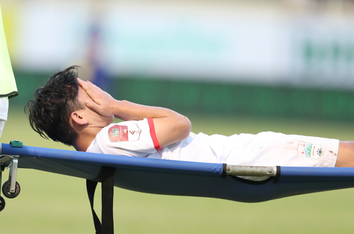 Sau khi thực hiện quả phạt góc, Minh Vương ngồi bệt xuống sân và không thể tiếp tục thi đấu. Tiền vệ quê Thái Bình ôm mặt đau đớn khi phải rời sân bằng cáng.