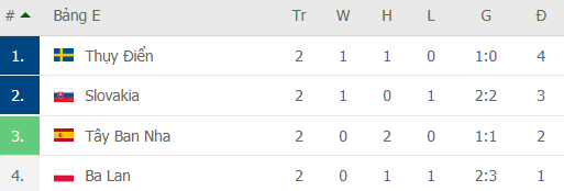 2 đội rời sân với tỉ số chung cuộc 1-1 và lần lượt đứng ở 2 vị trí cuối bảng E sau 2 lượt trận. Tây Ban Nha với 2 điểm trong tay đang thực sự lâm nguy. Nếu tiếp tục những màn trình diễn nghèo nàn của hàng công, thầy trò HLV Luis Enrique có thể phải ra về ngay sau vòng bảng. Còn Ba Lan cũng cần phải giành trọn 3 điểm trước Thụy Điển tại vòng đấu cuối nếu muốn đi tiếp.