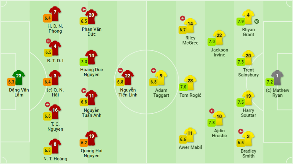 Điểm số 7,3 của Hoàng Đức không chỉ cao so với đội tuyển Việt Nam mà còn thuộc vào nhóm cao nhất nếu tính cả 2 đội. Bên phía Australia chỉ có 3 cầu thủ được chấm điểm cao hơn Hoàng Đức, bao gồm cả người ghi bàn thắng duy nhất Rhyan Grant (7,9 điểm). Còn lại có tới 11 cầu thủ nhận điểm thấp hơn 7,3 (tính cả các cầu thủ vào sân thay người).