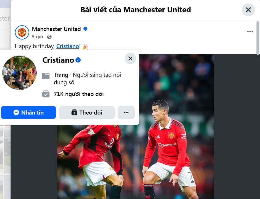 Cụ thể, trên trang fanpage có hàng chục triệu lượt theo dõi, MU đã đăng tải hình ảnh CR7 trong màu áo đỏ huyền thoại kèm những lời chúc tốt đẹp nhất. Thế nhưng, điều đáng nói là đường dẫn gắn thẻ lại không trỏ về trang chính chủ của siêu sao người Bồ Đào Nha mà lại hiển thị tên một tài khoản hoàn toàn xa lạ.