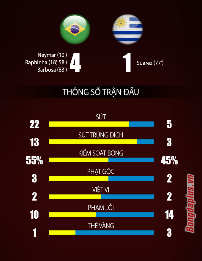 Đến phút 77, Luis Suarez đã gỡ lại 1 bàn cho Uruguay sau một pha sút phạt cực kỳ đẹp mắt. Tuy nhiên chỉ 4 phút sau, Gabriel Barbosa đã tái lập cách biệt 3 bàn bằng 1 pha đánh đầu cận thành sau đường chuyền của Neymar.