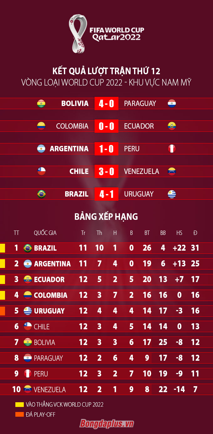 Kết quả cuối cùng trận Brazil vs Uruguay là 4-1 nghiêng về phía đội chủ nhà. Selecao vẫn vững vàng trên ngôi đầu BXH vòng loại World Cup 2022 khu vực Nam Mỹ với 31 điểm sau 12 trận (thắng 10 và hòa 1). Khoảng cách giữa họ và đội xếp thứ 2 là Argentina vẫn là 6 điểm sau khi Albiceleste giành chiến thắng 1-0 trước Peru. Trong khi đó, Uruguay vẫn đang đứng thứ 5 với 16 điểm.