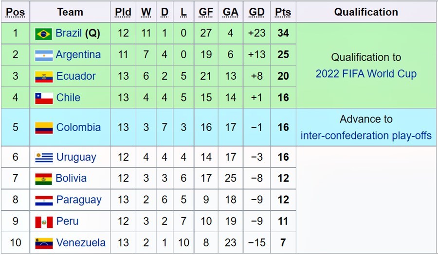 Với 34 điểm sau 12 lần ra sân, Brazil trở thành đội bóng đầu tiên ở Nam Mỹ chính thức điền tên mình vào VCK World Cup 2022. Họ bỏ xa vị trí thứ 5 tới 18 điểm dù còn 6 trận chưa đá.