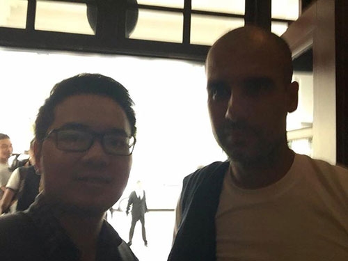 | Pep chụp ảnh cùng một fan hâm mộ ngay trước sảnh Metropole - Ảnh độc giả cung cấp |
