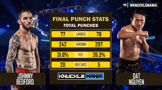 Trưa ngày 6/2, tay đấm gốc Việt Đạt Nguyễn đã bước vào trận tranh đai hạng gà với cựu võ sĩ UFC Johnny Bedford tại giải quyền Anh tay trần BKFC. Trước đối thủ được đánh giá cao hơn, VĐV 39 tuổi đã thi đấu quả cảm để giành về chiếc đai vô địch nhờ thắng lợi bằng điểm số.