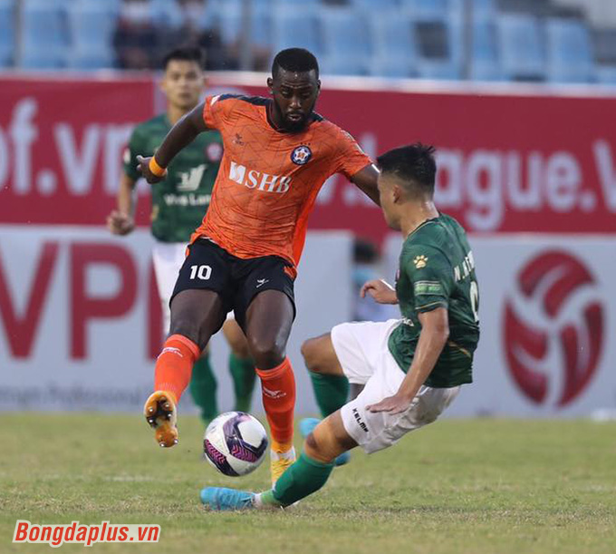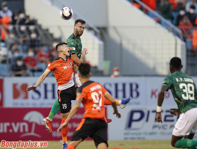 Bất lợi hơn so với đối thủ, không khó hiểu khi TP.HCM phải gồng mình chống đỡ những pha tấn công của SHB Đà Nẵng. Phút 33, ngoại binh Osaguona băng vào đánh đầu đưa bóng đập đất và hướng về cầu môn TP.HCM. Bóng xoáy và đi quỹ đạo khó chịu khiến thủ môn Thanh Thắng phải vất vả giải nguy khỏi khung thành.