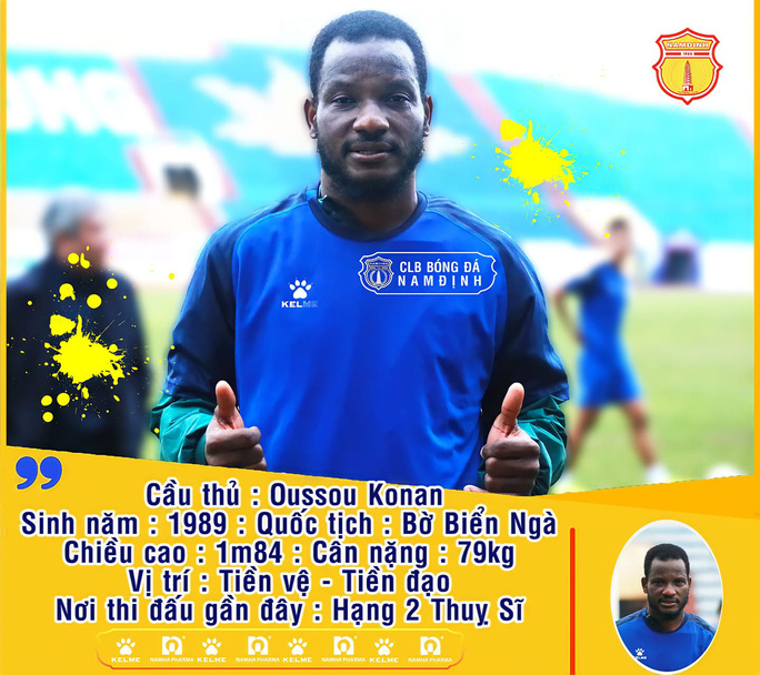 Cùng thời điểm, CLB Nam Định đã bổ sung tiền đạo Oussou Konan Anicet Harian Max Malon vào chiều 26-1. Chân sút người Bờ Biển Ngà sinh năm 1989, có chiều cao 1,84 m và nặng 79 kg. Trước khi gia nhập V-League, Konan đã thi đấu ở giải Hạng 2 Thụy Sĩ và có thể chơi tốt ở các vị trí tiền đạo, tiền vệ.