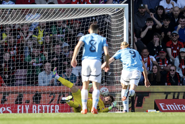 Không lâu sau khi thực hiện pha đánh đầu đầy uy lực mà chỉ tiếc là bóng lại bay chệch cột dọc khung thành Bournemouth, Erling Haaland phút 14 còn sút hỏng quả phạt đền khi đối mặt với thủ môn Kepa Arizzabalaga trên chấm 11m.