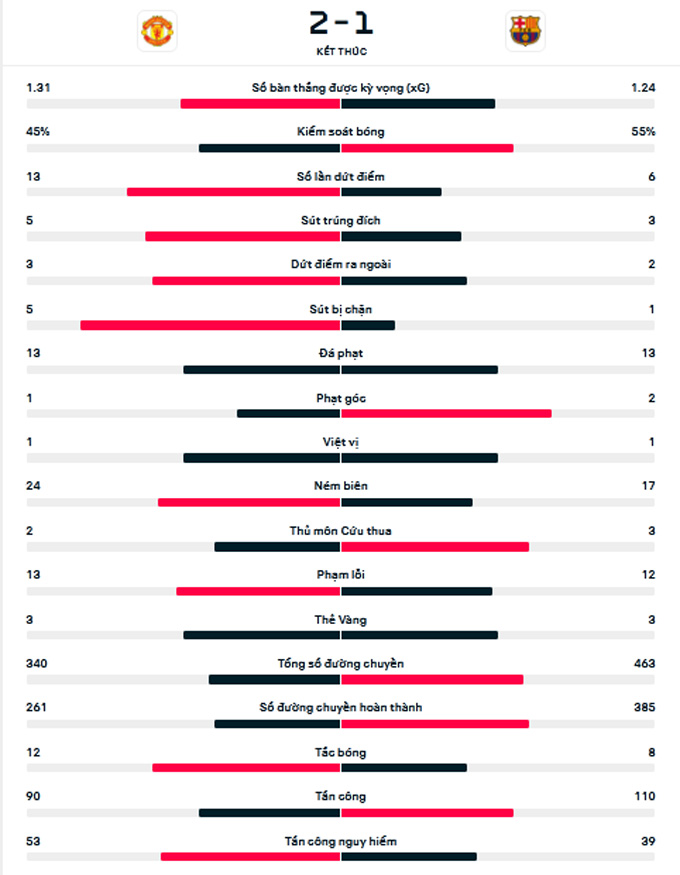 Thậm chí, Quỷ đỏ còn suýt phải nhận thêm bàn thua nếu các cầu thủ Barca chuẩn xác hơn sau tình huống chuyền bóng lỗi của thủ thành De Gea ở phút 44. 1-0 nghiêng về Barca là tỷ số của hiệp thi đấu đầu tiên.