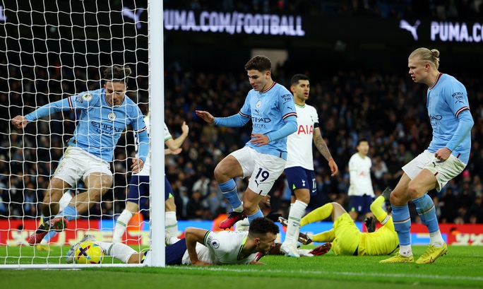 Tình hình xoay chuyển rất nhanh sau giờ nghỉ, lần này, Man City lại là đội nắm thế thượng phong. Julian Alvarez và Erling Haaland khai thác sự lúng túng của hàng thủ Tottenham để thay nhau lập công ở các phút 51 và 53, san bằng cách biệt và đưa trận đấu về vạch xuất phát.