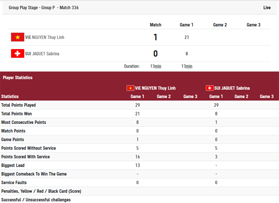 Ở lượt cuối vòng bảng cầu lông đơn nữ Olympic Tokyo 2020, Nguyễn Thùy Linh đối đầu đối thủ người Thụy Sĩ Sabrina Jaquet (Xếp hạng 46, trên, Thùy Linh 3 bậc).