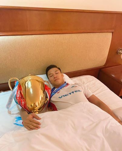 Trên trang Facebook của mình, cầu thủ sinh năm 1993 đã hớn hở đăng tải bức ảnh chụp anh và chiếc cúp trên giường ngủ, kèm theo đó là dòng caption: