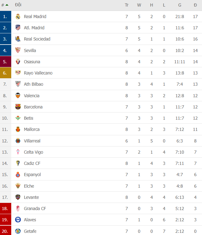 BXH La Liga: