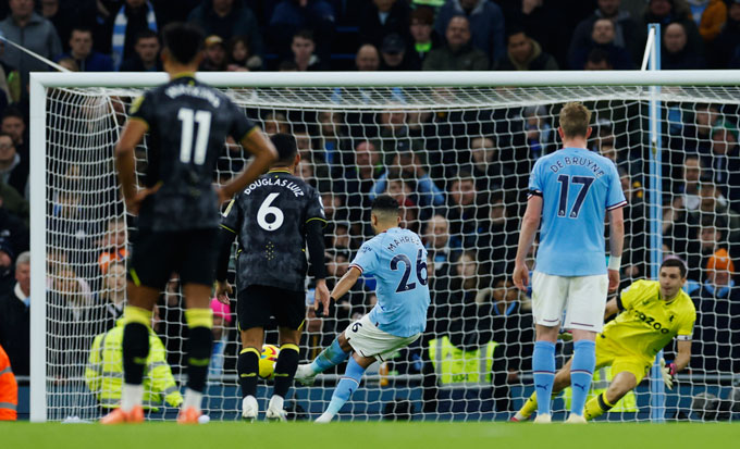 Trước khi hiệp 1 khép lại, Man xanh đã được hưởng 1 quả 11m sau khi Grealish bị Jacob Ramsey phạm lỗi trong vòng cấm. Mahrez là người thực hiện quả phạt đền và anh không mắc sai lầm nào để đánh bại Martinez.