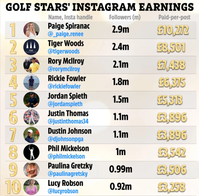 Đến ngay cả những huyền thoại của môn thể thao quý tộc như Tiger Woods, Phil Mickelson hay các ngôi sao đương đại như Rory McIlroy, Rickie Fowler, Jordan Spieth, Dustin Johnson... cũng phải chào thua trước một cô nàng thậm chí không thi đấu chuyên nghiệp. Huyền thoại Tiger Woods chỉ về thứ hai với 11.900 USD (274 triệu VNĐ) cho mỗi post, trong khi người xếp thứ ba là McIlroy cũng chỉ kiếm được 10.300 USD (238 triệu VNĐ).